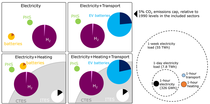 The analysis included in this paper overcomes the previous common understanding (“storage is needed in highly renewable energy systems”) by showing the emergence of two different kinds of storage technologies and the requirement to combine both to ensure the feasible operation of the system. The two storage technologies show fundamentally different characteristics (energy and power capacities) and operation patterns, ensuring the balancing of renewable fluctuations at different timescales.